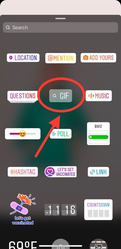 6. Search for your GIF and then tap the GIF you’d like to add to your story. It will appear in the middle of your photo, playing on a continuous loop.